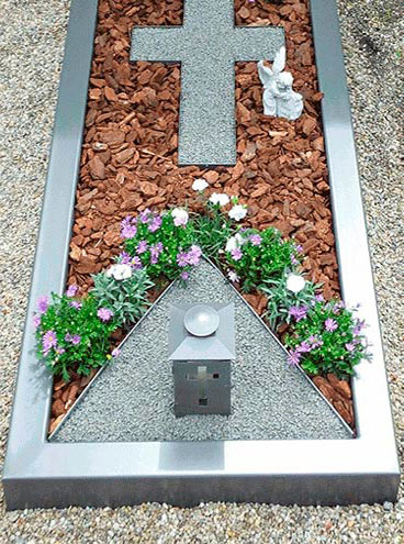 Die Grabeinfassung besteht aus einem hochwertigem Profilrahmen in Stahl oder Edelstahl und kann in den Standardfarben Braun, Weiß, Anthrazit oder Schwarz erstellt werden.
